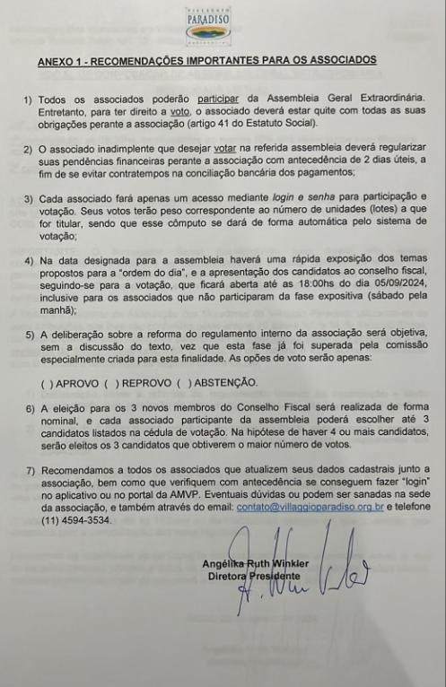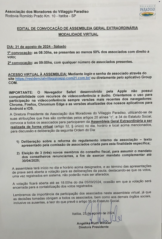 A Diretora Presidente da Associação dos Moradores do Villaggio Paradiso, utilizando-se de suas atribuições que lhes são conferidas pelos artigos 20 alínea “c”, e 34 do Estatuto Social, convoca a todos os associados para participarem da Assembleia Geral Extraordinária a ser realizada de forma virtual (artigo 32, § único) no dia, horário e local acima mencionados, para discussão e deliberação da seguinte Ordem do Dia: